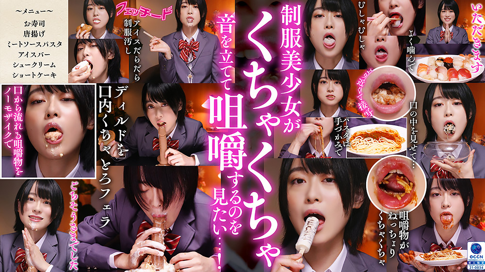 美しい女性がご飯を食べている時の口の中が見てみたい…。上品な雰囲気の女性がくちゃくちゃ音を立てて咀嚼、その口を開けて、咀嚼した物を器に吐き出す。お寿司を食べている時のくちゃくちゃ、唐揚げを食べる時のむしゃむしゃ音、どれも近くでじっくり見せてくれます。パスタは手づかみで口に入れ、ちゅるちゅるくちゃくちゃ音を立ててよく噛んでから咀嚼物を吐き出し。アイスをいやらしく舐めた後は、口を開けてぴったりニットにタラ~ッと垂れ流し…。最後はシュークリームを咀嚼して口の中で優しく温め、そのままディルドをくちゃとろフェラ。唾液とクリームがぐちゃぐちゃに混ざった咀嚼物をボトボト垂らしながらの極上フェラをノーモザイクで最後までじっくり堪能してください…!